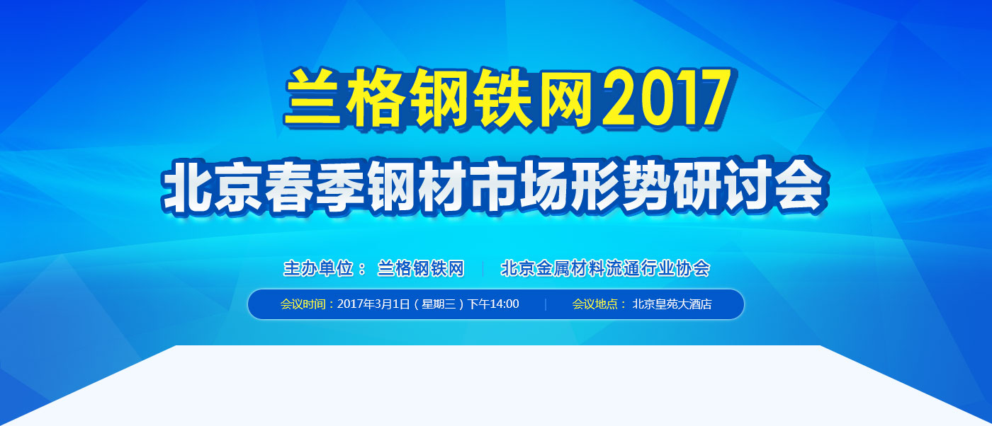 为帮助您更全面地了解2017年国内外经济形势对钢材市场的影响,及上半年钢材价格走势,北京金属材料流通行业协会、兰格钢铁网、兰格钢铁云商特联合举办“兰格钢铁网2017北京春季钢材市场形势研讨会”,诚挚邀请您参会,与业界专家和同仁共同研讨。